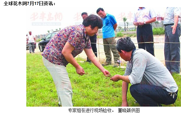 “篩選工作從2008年就開(kāi)始了,當(dāng)時(shí)主要選了大穗結(jié)縷草、溝葉結(jié)縷草、日本結(jié)縷草三種種子,用花盆通過(guò)控制土壤鹽濃度來(lái)做對(duì)比試驗(yàn),觀察草的生理特征和外觀結(jié)構(gòu)?!鼻噢r(nóng)大董曉穎教授介紹,當(dāng)時(shí)發(fā)現(xiàn)前兩者的耐鹽性更好。2012年董曉穎的“適于膠州灣鹽堿地綠化的草坪草品種篩選及示范(12-1-3-50-nsh)”項(xiàng)目申請(qǐng)成功,接下來(lái)她帶著課題組從北京、濱州、濰坊、青島等地收集了20余份草種,包括暖季型的大穗結(jié)縷草、狗牙根、溝葉結(jié)縷草、日本結(jié)縷草,冷季型的高羊茅、黑麥草、早熟禾、剪股穎和三葉草等,通過(guò)培養(yǎng)皿發(fā)芽、穴盤(pán)育苗、盆栽等耐鹽篩選試驗(yàn),篩選出了暖季型草大穗結(jié)縷草、狗牙根、溝葉結(jié)縷草,冷季型草“金太陽(yáng)”、“雅典娜”、“綠寶石”6個(gè)較耐鹽堿的草坪草種,并于2013年春播種或移栽在城陽(yáng)區(qū)棘洪灘墨水河入??诘柠}堿地(土壤含鹽量0.59%,pH8.3)上,經(jīng)過(guò)發(fā)芽、生長(zhǎng)、越夏、越冬等過(guò)程,來(lái)對(duì)草種的耐鹽堿性進(jìn)行實(shí)地檢驗(yàn)。7月5日,來(lái)自濰坊農(nóng)業(yè)科學(xué)院、青島市林業(yè)局、平度市農(nóng)業(yè)局和城陽(yáng)區(qū)林業(yè)局的五位專(zhuān)家進(jìn)行了鹽堿地建坪適應(yīng)性的現(xiàn)場(chǎng)驗(yàn)收。專(zhuān)家組綜合評(píng)價(jià)后認(rèn)為,暖季型的大穗結(jié)縷草、狗牙根、溝葉結(jié)縷草的草坪覆蓋率高達(dá)100%,表現(xiàn)了極強(qiáng)的耐鹽性,冷季型高羊茅“雅典娜”、“金太陽(yáng)”的草坪覆蓋率分別為95%、93%,表現(xiàn)了較好的耐鹽性。