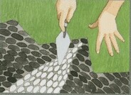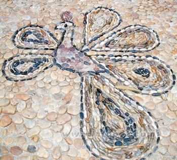 按照自己設計的圖案依次將卵石、圓石、碎石鑲?cè)胨嗌皾{之中。填充完成之后,使用泥鏟將卵石上邊干的水泥砂漿刮掉,并檢查鋪裝材料是否穩(wěn)固,如果需要的話還應使用水泥砂漿對其重新加固。