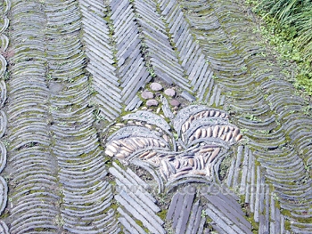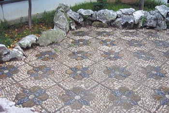以瓦片作為鋪裝主體,卵石組合圖案為點綴。風格精致,意境幽遠。