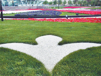 以白色鵝卵石為基調(diào)的小廣場地面,規(guī)律地布置著花瓣圖案。整體效果顯得十分精致。