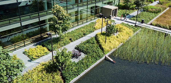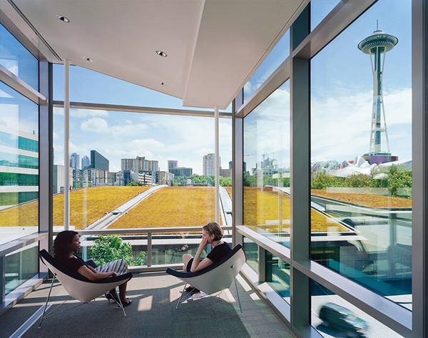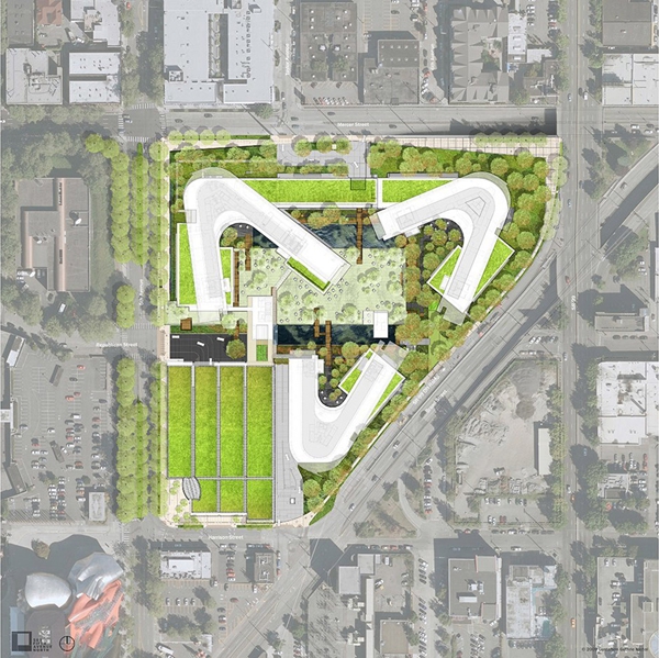 基金會園區(qū)的建設(shè)將西雅圖中心受污染的12英畝停車場改造成為全球合作和地方參與的生態(tài)環(huán)境和社會可持續(xù)發(fā)展的樞紐。景觀建筑師將其設(shè)計為可以聯(lián)系員工們的區(qū)域,使周邊社區(qū)再生,滿足基金會扎根本土的全球性使命的原則。