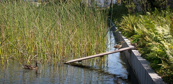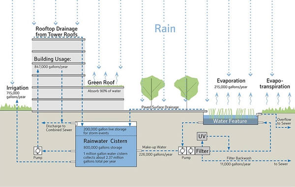雨水收集看似簡單,但它是維持復(fù)雜的生態(tài)系統(tǒng)的關(guān)鍵所在。在項目開始時,私建雨水收集系統(tǒng)在西雅圖還是非法的。景觀設(shè)計師和工程團隊曾與基金會、西雅圖市和金縣一起同華盛頓國務(wù)院生態(tài)管理署爭論“水權(quán)”是不必要的。這個論點很簡單:在城市化地區(qū),由于所有降雨都將進入合并的雨水排水系統(tǒng),超出基礎(chǔ)設(shè)施負荷,收集和再利用雨水用于現(xiàn)場可以產(chǎn)生更大的益處。實施這一新方法管理水資源已經(jīng)為周圍流域的健康做出了貢獻。