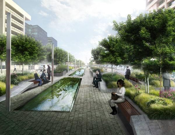 綠色基礎(chǔ)設(shè)施與綠色街道和綠道成比例,用作肥沃的區(qū)域,生長(zhǎng)一些本土產(chǎn)品、輸送水源。設(shè)計(jì)師將一條6車道、瀝青高速改造成一條綠道,供自行車、行人和農(nóng)業(yè)生產(chǎn)使用。從雨水和其他來(lái)源中收集的有機(jī)廢水,經(jīng)過處理再利用,供給社區(qū),減少70%的市區(qū)可飲用水使用量。