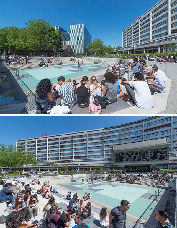總之,這有3個(gè)收集雨水的盆地。當(dāng)淺盆地變干時(shí),它們就成為人們運(yùn)動(dòng)、玩耍的區(qū)域。其中的一個(gè)用于滑板;第二個(gè)是一個(gè)小島,地面干凈、閃閃發(fā)光;第3個(gè)用于足球、排球和籃球。每個(gè)入口都有私人空間與精挑細(xì)選的草地和野花,環(huán)繞在現(xiàn)存的樹木周邊。