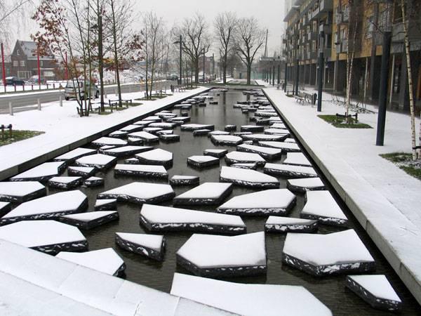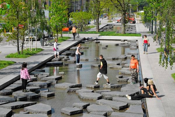 該項(xiàng)目完工于2013年,包括一個(gè)雨水廣場(chǎng),將雨水存儲(chǔ)與城市公共區(qū)域的投資結(jié)合起來(lái)。設(shè)計(jì)師決定水元素必須是“可見的”,同時(shí)要穿過廣場(chǎng)。