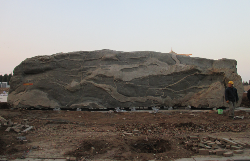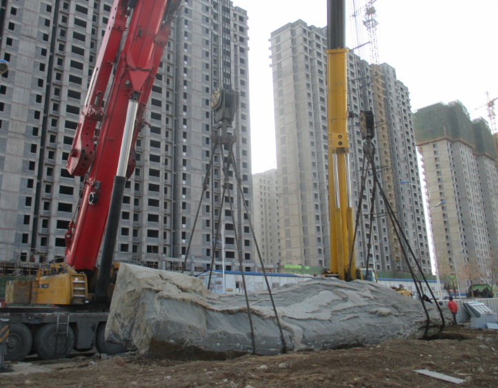 12月11日章丘龍盤山公園龍山廣場處安放泰山石一尊。該尊泰山石長12米,高2.8米,寬2米,總重量約200噸,由一整塊完整石材構(gòu)成,紋理清晰,脈絡(luò)明顯,遠(yuǎn)望恰似一條巨龍飛舞,與龍盤山名稱相吻合。景石從起吊到安放到位耗時(shí)一天,動(dòng)用大型起重機(jī)兩臺(tái),經(jīng)過現(xiàn)場管理人員的合理布置,統(tǒng)一指揮,最終將其成功安置在指定位置。
