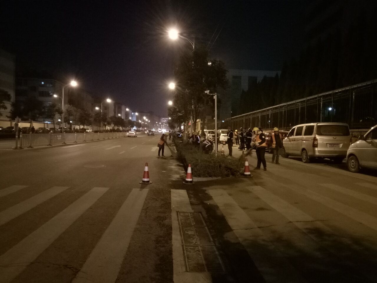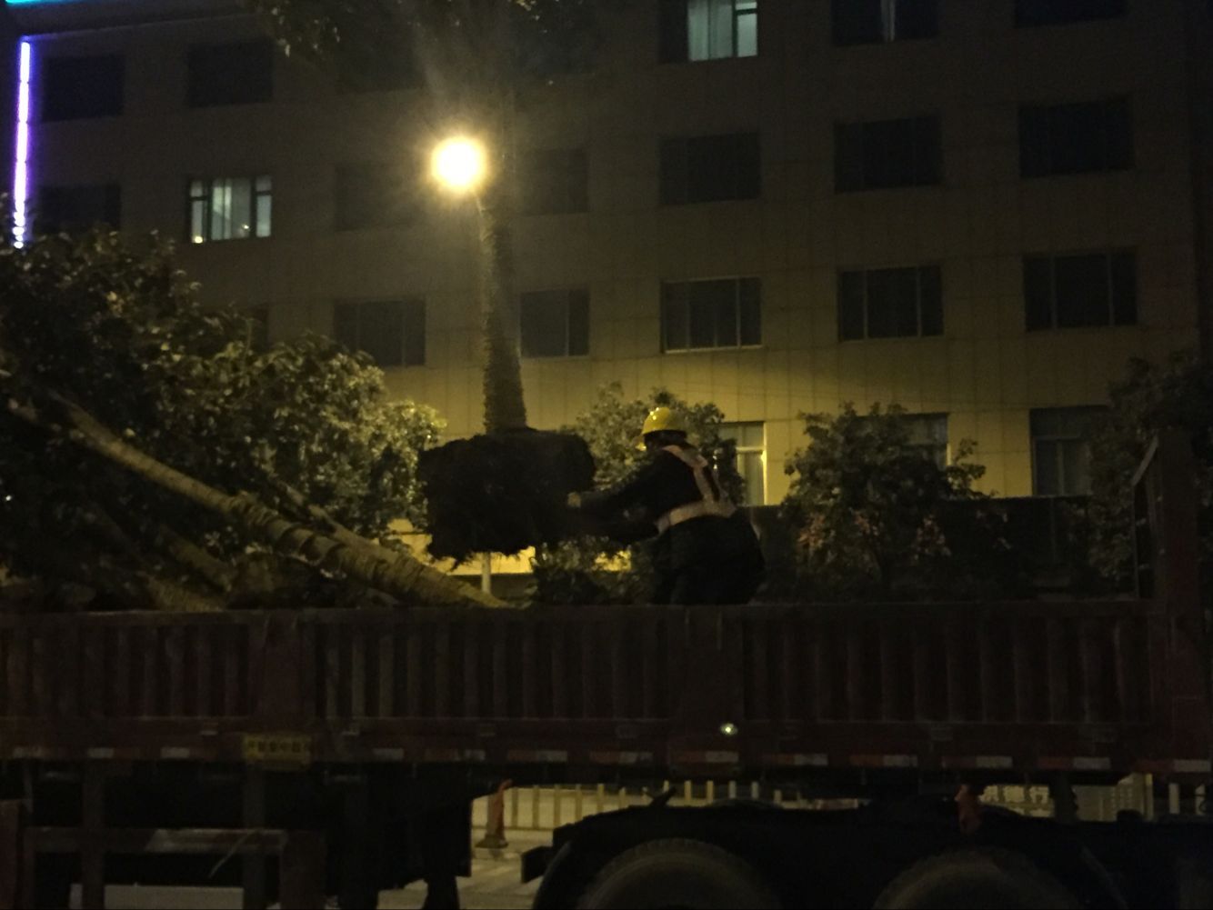匯友市政園林集團順時安排下去,由分公司副經理王紅磊統(tǒng)籌安排,項目經理謝艷清進行人員調動與現場施工。接到本次任務已是下午三時,較短時間的組織機械、籌備隊伍進行工程策劃對淡季的園林公司來說比較棘手,材料設備部與安全環(huán)保部的完美配合,不到2個小時的時間機械、物資、人力都全面到位等待夜間施工的到來。